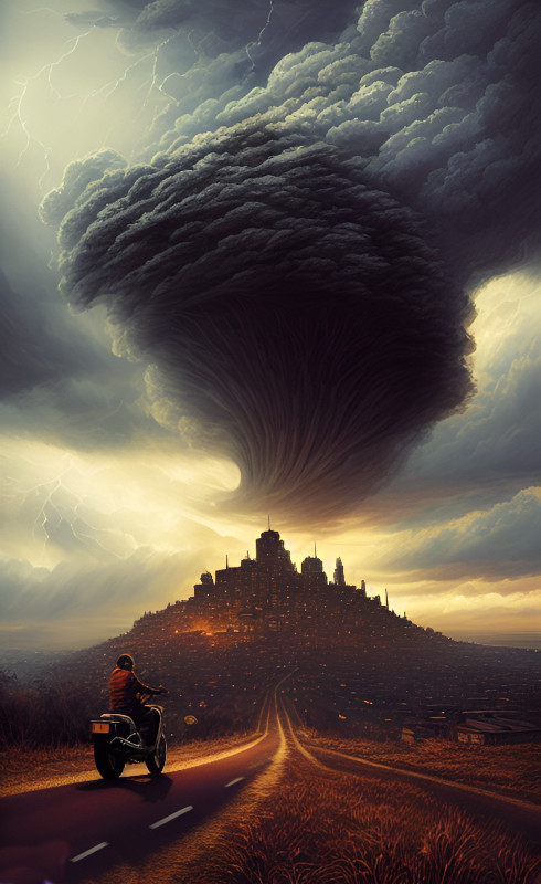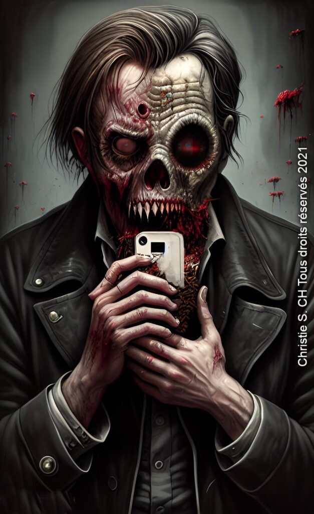 Christie ©2022 tous droits reservés Dans ce paysage apocalyptique, des groupes de survivants tentent de fuir le chaos. Leurs visages marqués par la fatigue et la peur témoignent des horreurs qu’ils ont traversées. Certains portent des sacs chargés de biens essentiels, d’autres se tiennent la main, cherchant un semblant de réconfort et de solidarité dans cet océan de destruction. Ils regardent la moto avec curiosité et espoir mais le motard continue sa route, évitant tous les débris et les cadavres.