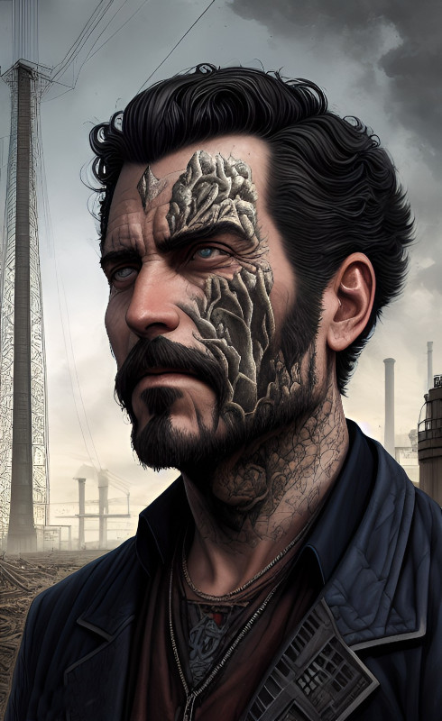 Le punk anglais enlève lentement son casque, révélant un visage marqué par les épreuves et les cicatrices. Son regard vitreux et lointain traduit une lassitude profonde, comme s’il avait contemplé trop d’horreurs dans ce monde déchu. Son visage est orné d’un tatouage réaliste, qui semble délibérément dissimuler une brûlure ou une malformation. Les traits sombres tracés avec précision témoignent de son désir de masquer une partie de son passé tourmenté.